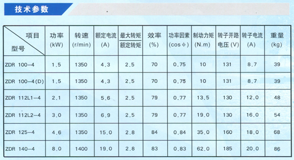 ZDR系列錐形繞線轉子三相異步電動機,可串接電阻起動,使其機械特性能人為隨意變軟,能在較小的起動電流下提供較大的起動轉矩;可進行小士圍調速。它起動平穩,制動安全,且能與減速機配套,用于驅動起重機械及**率機械和其它需要制動平緩的傳動機械?! DR系列電動機采用380V電源,50Hz,基本工作制為S4,負載持續率25%,等效起動次數120次/小時。 ZDR系列電動機為封閉式結構,防護等級為IP44,冷卻方式為自冷式IC0141,絕緣等級有B級和F級兩